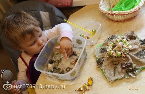 Дальше можно предложить перекладывать объекты по одному из основного контейнера в меньший или на небьющуюся глубокую тарелочку… в первый раз ребенок будет каждый объект крутить-щупать-рассматривать. Обратите внимание на фото фигурка черепашки с откидывающимся панцирем, в которой я вложила скраповую монетку-подвеску )))