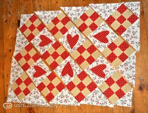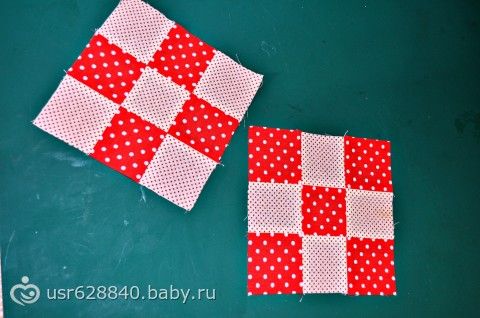 Это шесть квадратов из фоновой ткани, шесть красно-бежевых и шесть бежево-красных. Ну и еще треугольники, фоток которых я не нашла :)))
