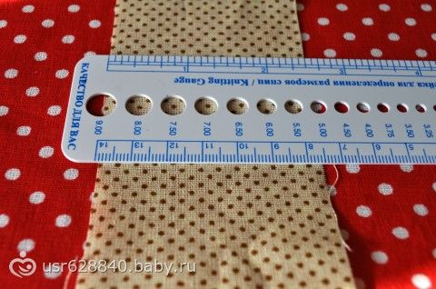 Итак, если у вас лапка у машины в четверть дюйма мы выкраиваем 3 полоски из ткани красной в белый горох и 3 полоски бежевой ткани шириной два с половиной дюйма. Они получаются длинными, но мы их не режем ни в коем случае на мелкие квадраты, а просто откладываем в сторону.