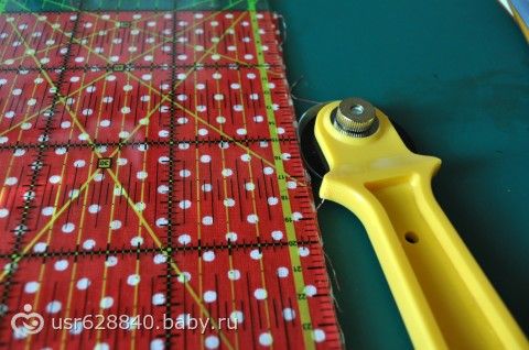 Теперь немного о технике кроя. Если у вас ножницы — лучше будет наносить линию разреза маркеров, как у меня или мягким карандашом и аккуратно по ней резать. Я же расскажу про раскрой с помошью мата, линейки и дискового ножа. Нож у меня самый простой и дешевый, сменные лезвия к нему продаются в рукодельных магазинах. Мата у меня два, зеленый, который служит фоном для некоторых фотографий — огромный, на пол стола. Он еще прекрасно служит ковриком для мышки. Есть еще маленький походный мат размера А4.
