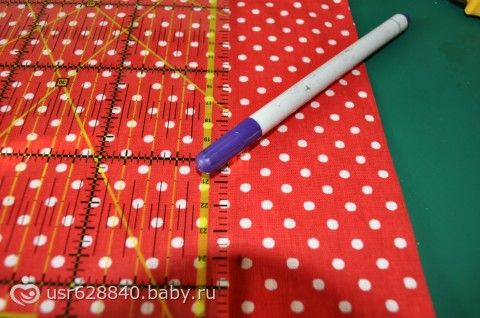 … ровный четкий срез! Это мы подготовили ткань к раскрою. Затем я отмечаю точками на ткани нужное расстояние от среза и по точкам режу второй раз. Все чисто, аккуратно, без лишних линий и очень точно. А с дюймовой линейкой теперь и отмерять ничего не надо — режу совмещая шкалу на линейке.