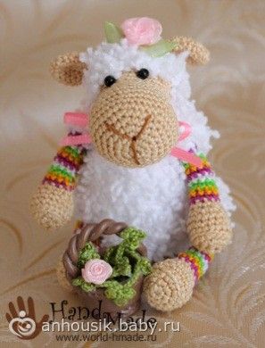 После того, как мордочка будет готова, можно пришить ушки. И вот теперь пришиваем голову к туловищу. Я делала это обычными нитками, потому что пряжей, из которой связаны чубчик головы и туловище шить совсем неудобно.Ну и наконец пришиваем лапки. Поэкспериментируйте с их положением, чтобы овечка сидела и не заваливалась на бок.