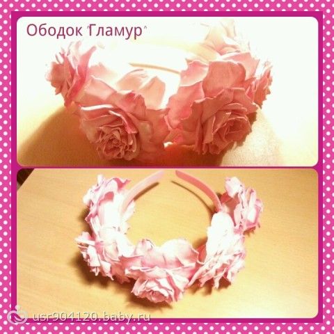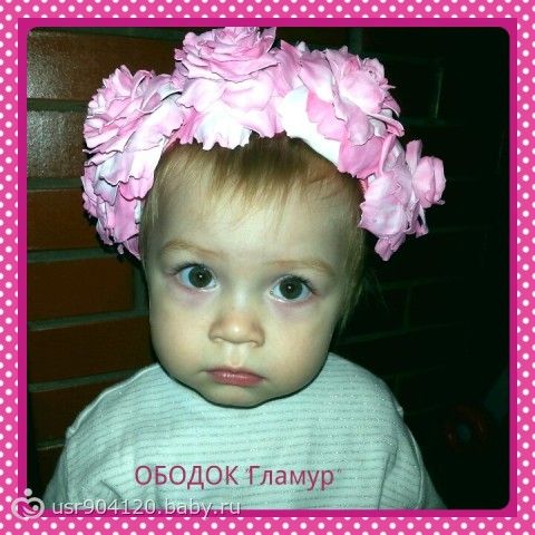 Всем привет… вот сделала ободочек… для гламурных девочек)… Пока что без хозяйки… принимаю критику. Ободок нацепила на дочь чтоб сфоткать… она немножко грустная, т.к сидела на горшке и я ей мешала своей фотосъёмкой)) На взрослой голове выглядет немного подругому. Розы крупные, яркие — белая платичная замша затонирована розовым — почти фуксия цветом.