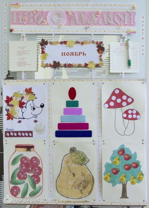 Загодя в качестве информации для мамочек, чьи детки занимаются в центре, я подготовила стенд с ноябрьскими образцами работ (к слову, с дочкой уже подготавливаем декабрьские зимние работы).