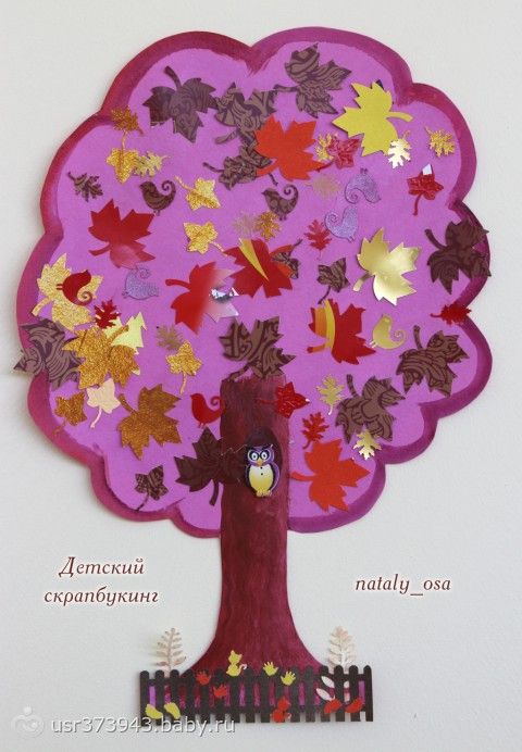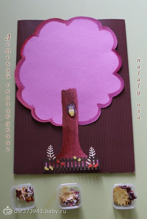 Для самого первого урока было решено делать коллективную аппликацию осенних разноцветных листьев на одно большое дерево. Запаслась в канцелярском магазине картоном для пастели формата А3, канцелярскими клей-стиками по числу учеников. Надыроколила разномастных листиков и немного птичек. Нарисовала дерево с дуплом, в которое на клеевый пистолет усадила совушку. Для колорита и детского интереса дополнила дерево деталями — вырубным заборчиком и детскими пяточками-ладошками (вроде как мимо пробегали детки, заглядывали за изгородь).