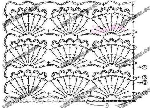 Основным узором для вязания платья является узор Веерочки. Я подобрала 3 варианта узора, но наиболее близким к оригиналу является . Платьице начать вязать с кокетки, которая состоит из трех полос. К третьей полосе прикрепляется нить и вяжется изделие по кругу, при этом оставить отверстия для пройм.