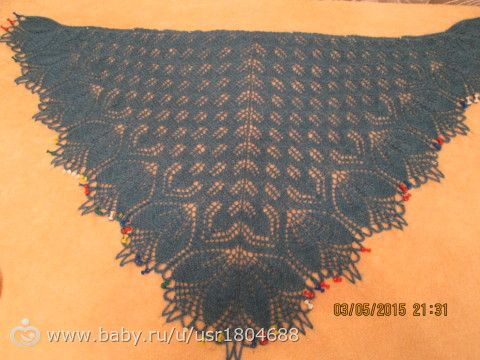 Давно поглядывала на нее, но все боялась не справится.А тут пока ожидаю пряжу решила занятьсячестно помучалась(((ну вот что вышло.Правда не совсем шаль получилась скорее шейный платок(120 на 60).Делала по описанию и смутно представляла результат.Так бы конечно я ее побольше связала бы, но распускать не буду