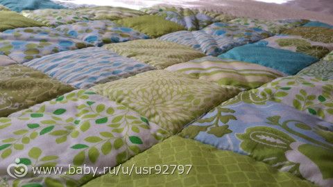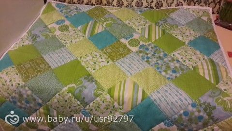 Квадратики делала по 12,5х12,5 см, одеялко получилось 100 х 100 см. Лоскуточки покупала 50х50 см. Оно у меня ромбиками сделано.