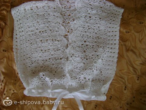 71. В край изделия между ракушками продеваем атласную ленту, завязываем узелком, а затем еще одним узелком через край планки, чтобы ленточка «сидела на месте» при завязывании болеро.