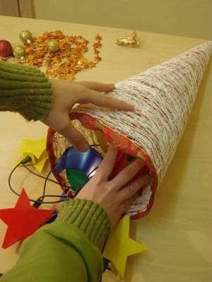 - Из листа ватмана сворачиваем конус. Или сам лист перед этим или уже готовый конус полностью оклеиваем скотчем (лист оклеить проще). Это необходимо для того, чтобы потом было легко снять ёлку с основы.