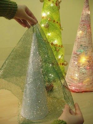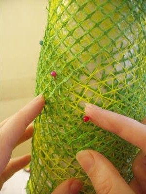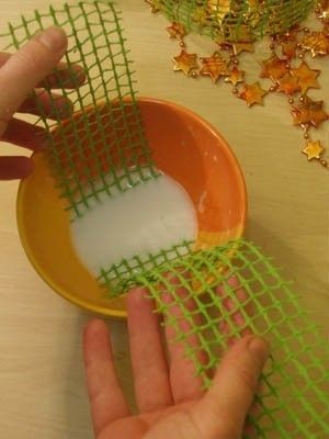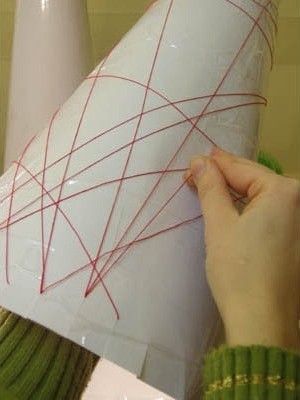 - С первого взгляда этот способ кажется менее трудоёмким, чем обматывать конус нитками, но на деле требует большей сноровки и терпения. Сетку стоит нарезать небольшими отрезками, для начала ее можно закрепить на конусе скотчем или булавками. Отрезки сетки можно опускать в плошку с разбавленным ПВА или наносить клей кистью. А лучше совместить эти два способа.