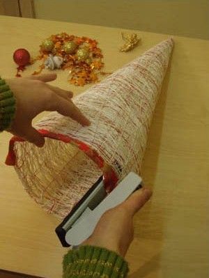 - Низ ёлки обрабатываем лентой для подарков. Это можно сделать, пришивая ленту иголкой с ниткой, а можно упростить процедуру и сделать это степлером.