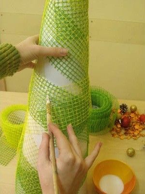- Берём мягкую сетку для букетов. Здесь использована зеленая с золотистой нитью, но ваша ёлка может быть такого цвета, как вы пожелаете (это же ваша ёлка!).