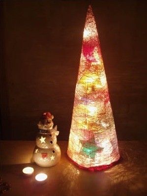 - Внутрь ёлки засовываем гирлянду. Такая гирлянда, как на фотографии, держится внутри конуса легко за счет пластиковых звёздочек и цветочков. А гирлянду с простыми лампочками можно закрепить с помощью маленьких елочных игрушек и колокольчиков, у которых есть проволочные усики, или можно использовать обычные канцелярские скрепки.