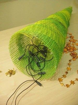 - Оборачиваем сетку вокруг конуса, а снаружи закрепляем декоративным шнурком.