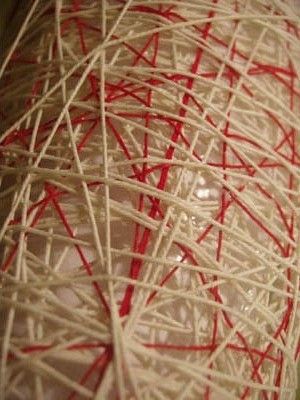 - Несмотря на то, что разбавленный ПВА кажется слишком жидким, когда он высохнет, нитки приобретут нужную жесткость. Для работы лучше всего подойдут обычные толстые нитки, но годятся и остатки мулине и шерсти. Можно поэкспериментировать с разными цветами, толщиной и фактурой ниток. Я свою ёлочку сделала из традиционных новогодних цветов – белого и красного.