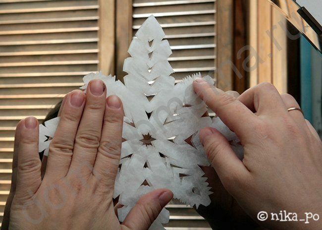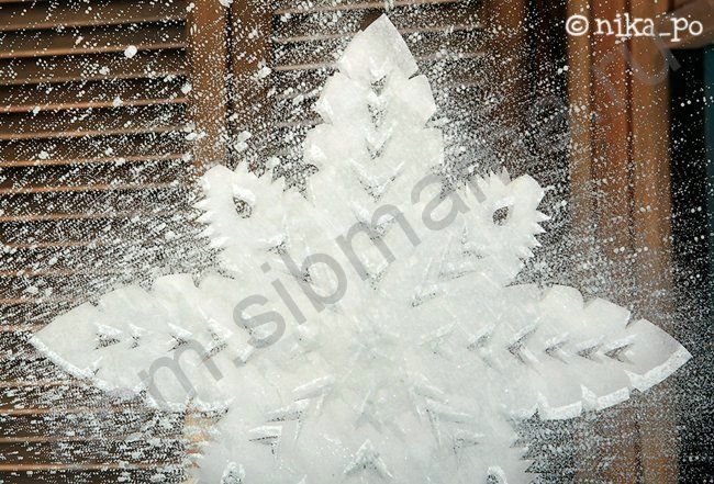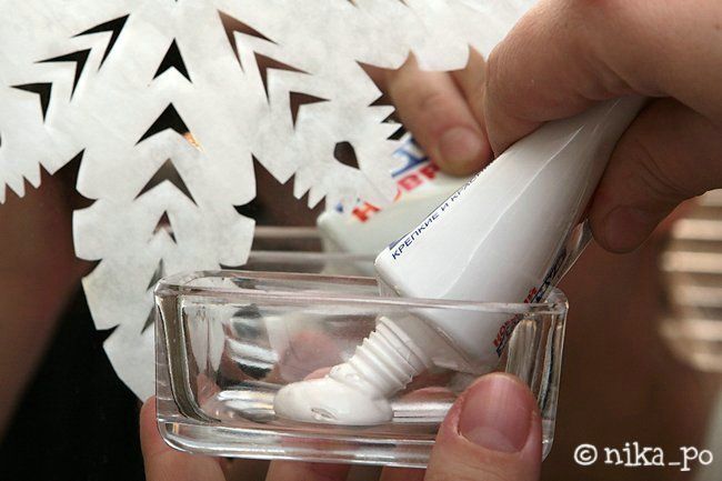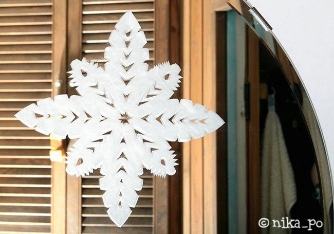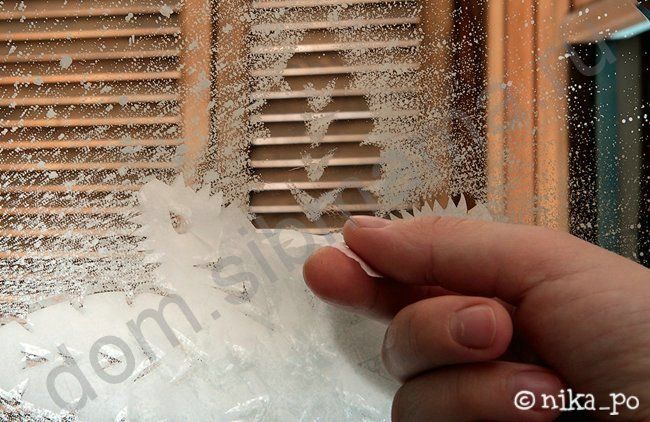 Бумажную снежинку слегка увлажнить и прилепить на заркало. Влагу вокруг снежинки промокнуть тряпочкой.