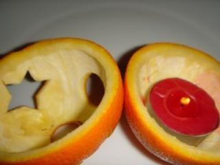 Красивые свечки из апельсина легко можно сделать своими руками. Разрежьте апельсин, выньте из него внутренности. Вырежьте аккуратно острым ножом рисунок или любой узор. Вставьте внутрь небольшую свечку и поставьте это украшение для праздничного стола.