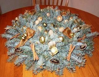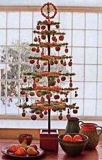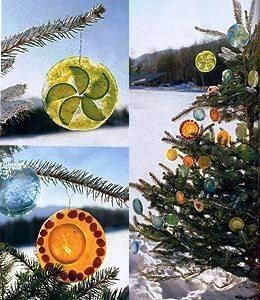 Такая «вкусная», украшенная фруктами и сладостями елка будет смотреться необычно и оригинально. Для оформления подойдут любые твердые фрукты, такие как кумкваты, мандарины, яблоки, груши или сливы. К фруктам можно добавить традиционные для «елочного» декора конфеты, мармелад и завернутые в фольгу грецкие орехи и печенье. Попробуйте также сделать из кумкватов «фруктовый» обруч, нанизав их на тонкую проволоку и замкнув ее концы вокруг ствола дерева.