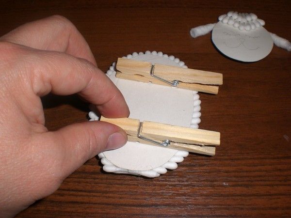 К туловищу приклеиваем прищепки ( они будут служить нам ногами).