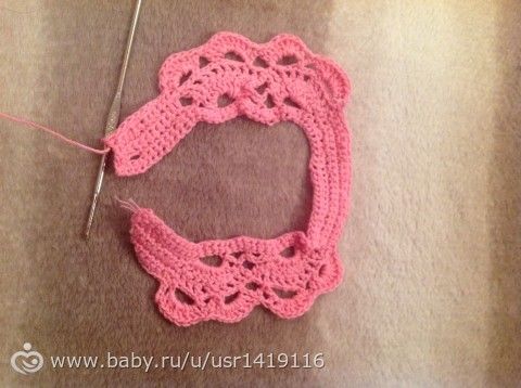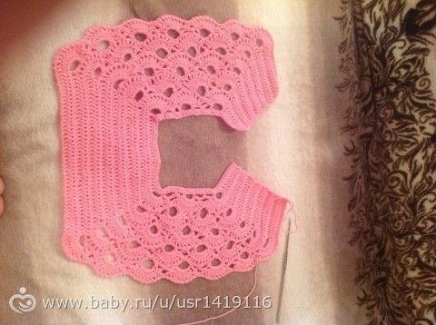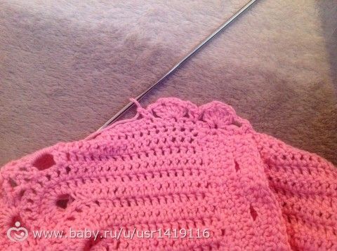 Дальше замыкаем нашу кокетку в круг, не забываем, что планку накладываем друг на друга и провязываем, в пройме набираем по 16 воздушных петель (достаточно 5, моя ниточка тонкая) это делается для того, чтобы ни стеснять движения. На первом фото видно эти 16 петель провязанных.
