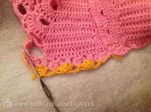 Начнём: после того как вы провязали последний ряд столбиков без накидка в поясе, переходите к вязанию волана.