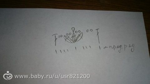 3 петли пропускаем и в 4 петлю: 1 пышный ст (3 ссн с общей вершиной), 2 вп, 1 пышный ст, пике из 3 вп, 2 вп, 1 пышный ст, 2 вп,