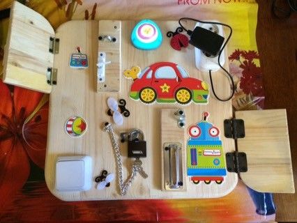 Решила сделать своему малышу бизиборд.Обрадовалась, что раньше заснул, думаю начнут, ага фиг там.Сын через 2 часа решил выспаться и теперь сна ни в одном глазу, и крутить не даёт, помощник мой))