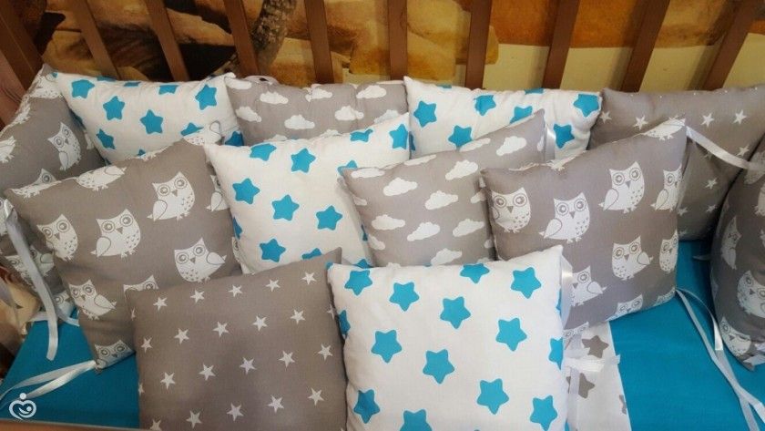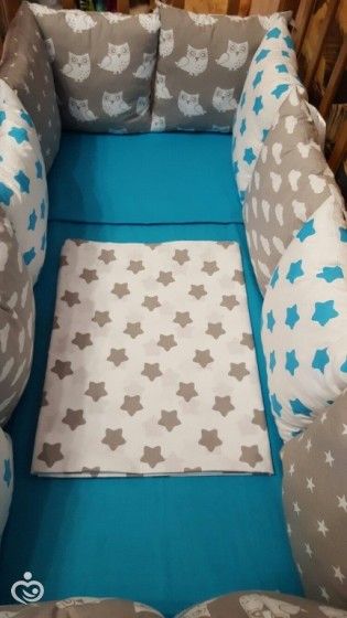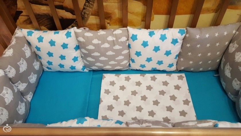 Комплект в серо-бирюзовой гамме(бортики в кроватку и постельное белье)?Сделано на заказ для замечательного мальчика, могу повторить???