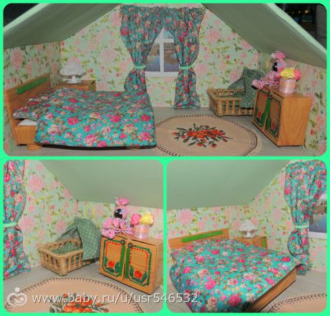 с ними живет младший малыш-пупс, в углу его колыбелька с балдахином. В комнате: кровать родителей, тумба с торшером, комод с букетом цветов, ковер на полу.