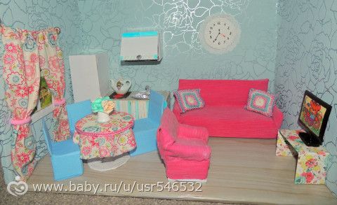 Диван и кресло из коробочек, обшито джинсовой розовой тканью, внутри немного ваты для пузатости)) Подушки из вязаной ткани, внутри сентипон.