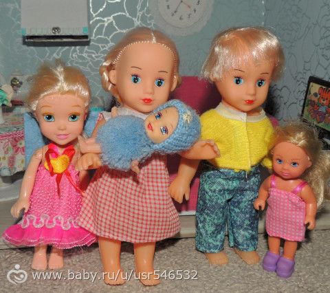 Папа и мама — 20см, детки — одна кукла 15см, вторая Ева 12см, пупс был в закромах))