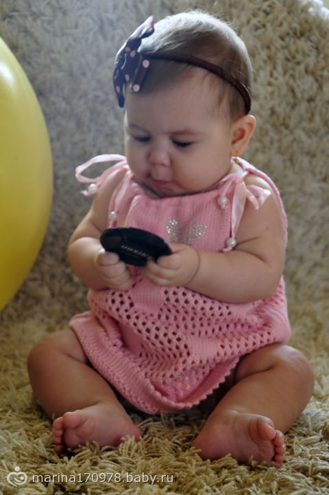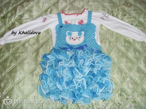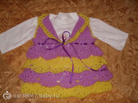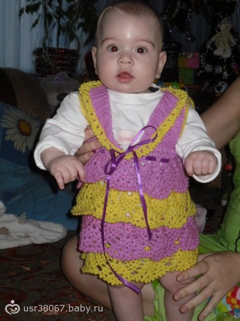 Плюс данного сарафанчика в том, что его можно одеть с боди и можно носить долго, делая длиннее завязки по мере вырастания ребенка. Потом вместо сарафана можно его использовать как топ.