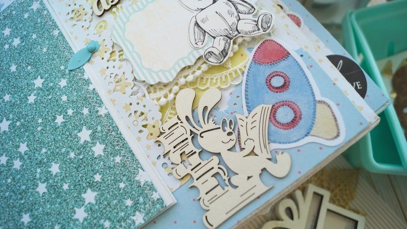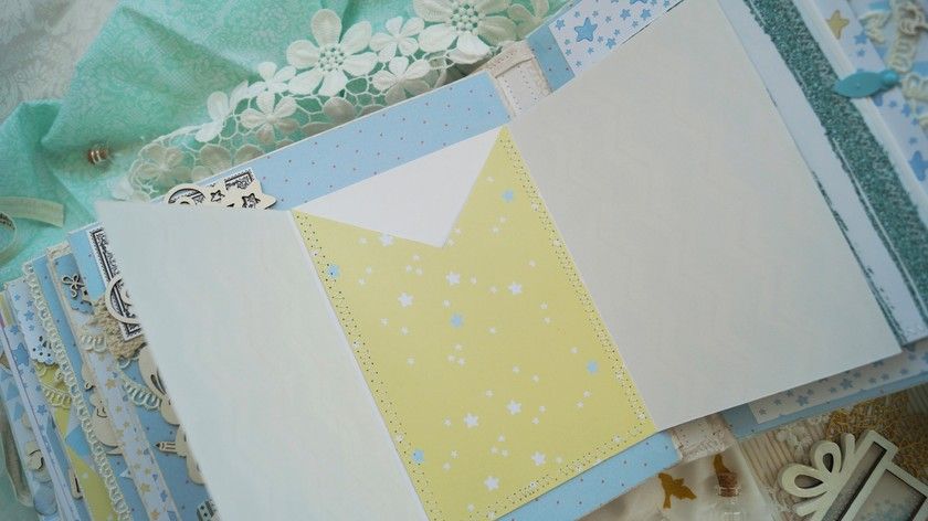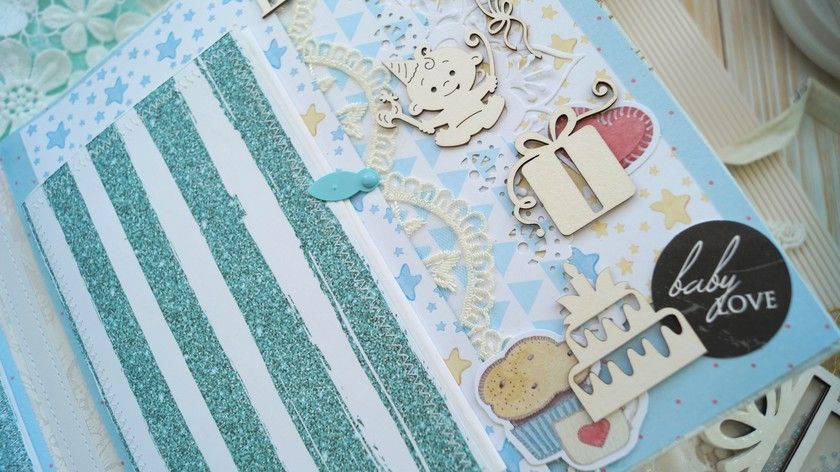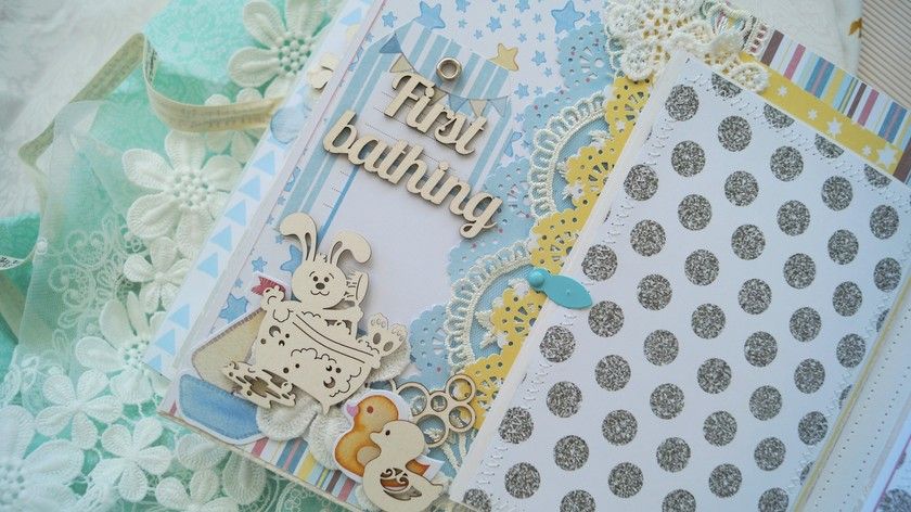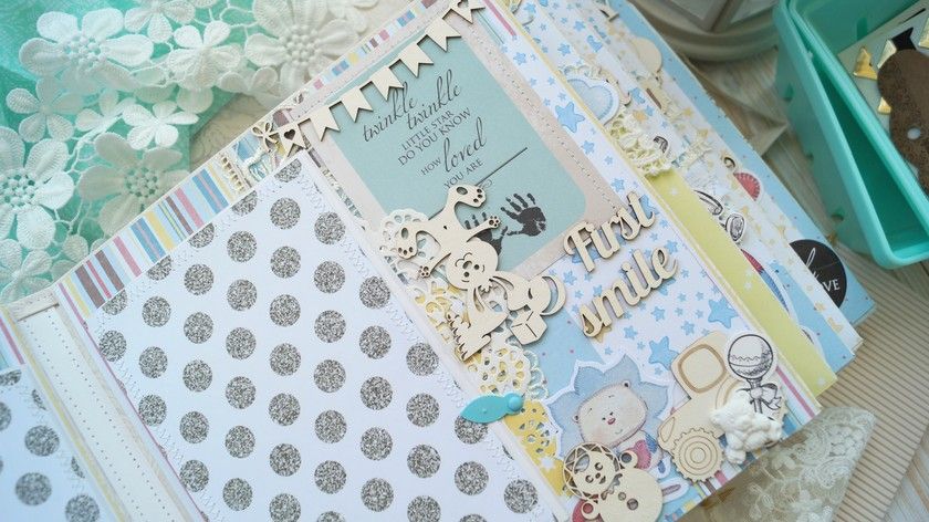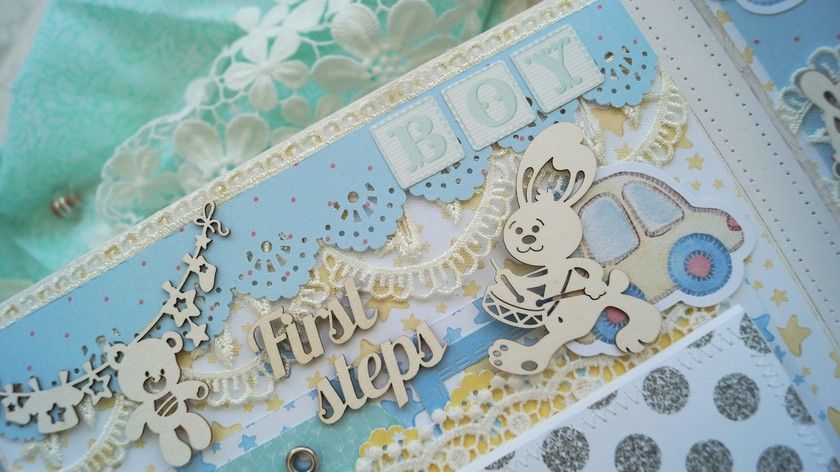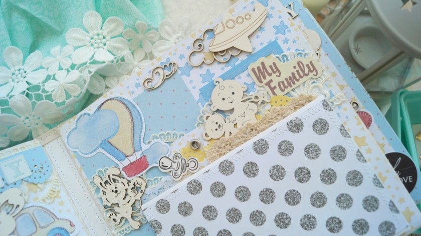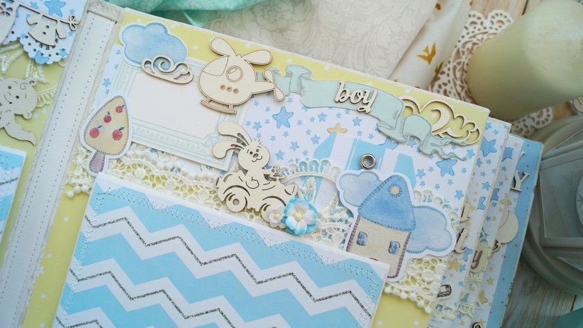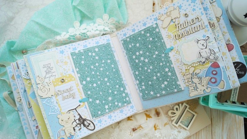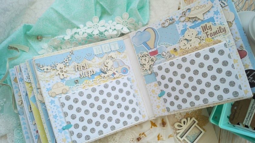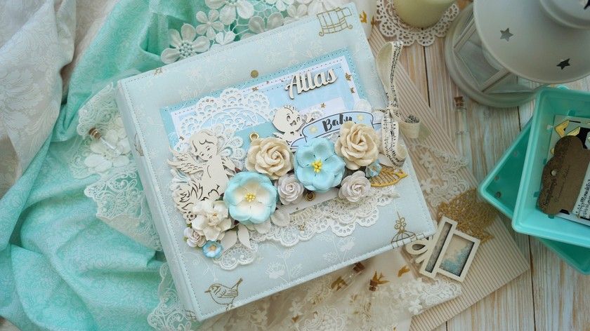 Наконец-то могу вам показать это чудо) Детский альбом для малыша Атласа)) Да, да))) альбом поедет за границу в Турцию) Размер альбома 20*20 см, 6 разворотов — 12 страниц, альбом полностью обшит американской тканью, 100% хлопок. Странички украшены большим количеством украшений)) Ну что, а теперь смотрим))