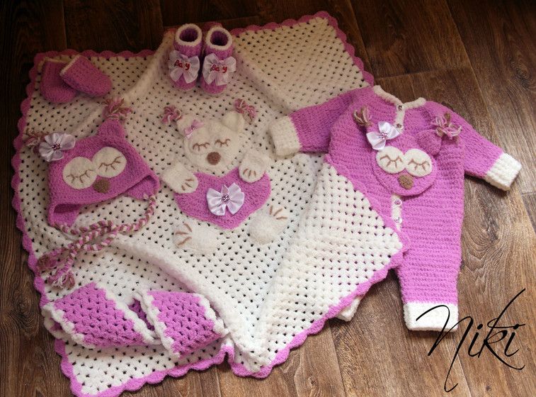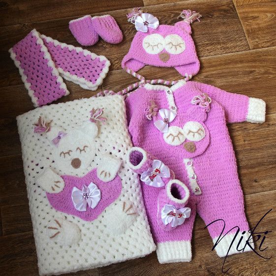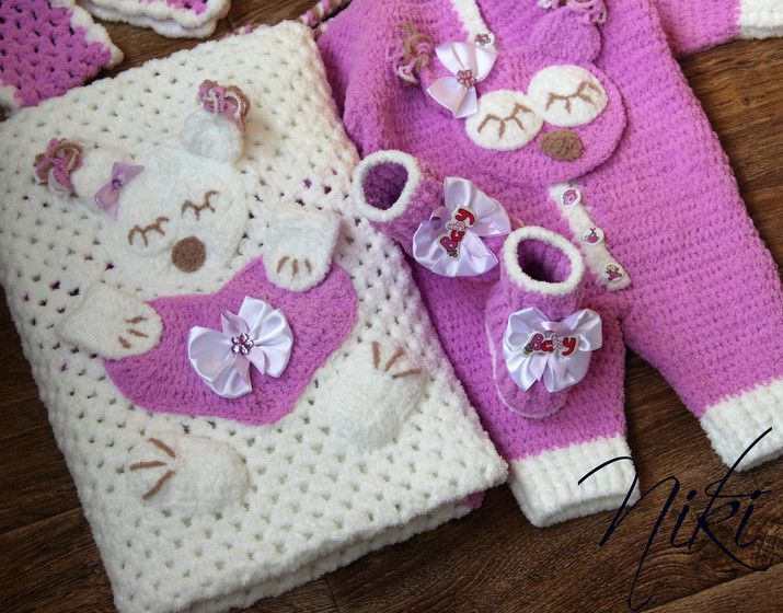 10) большой плюшевый набор — плед в коляску, комбинезон, шапочка, шарфик, пинетки, царапки.