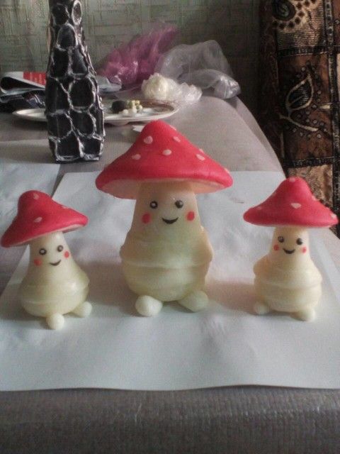 Осваиваем с дочуркой технику холодный фарфор. Вот наше первое совместное «изобретение». Сделали таких грибочков мухоморчиков, вроде бы веселые получились. Мы им даже имена придумали Самый большой — Боровичок, тот, что слева — Лесовик, а справа — Муха (от мухомор :)).