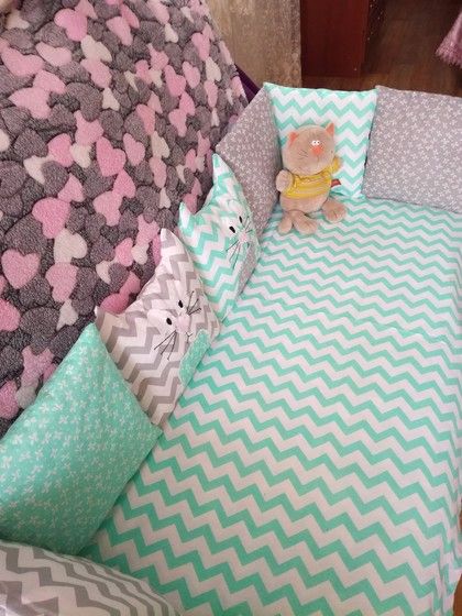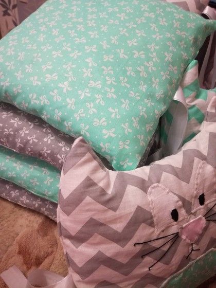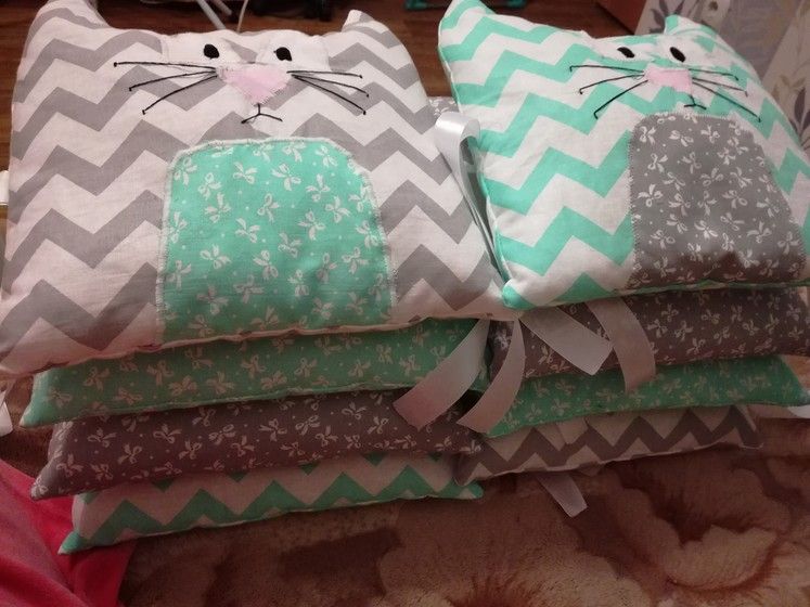 Вот такие бортики в кроватку есть в наличии. 2 бортика-игрушки (котики) и 6 обычных бортиков-подушек. Материал 100% хлопок, наполнитель холафайбер. Стильная расцветка, подойдет и мальчику и девочке.Благодаря небольшому размеру бортиков, можно снимать и стирать отдельные бортики, а не все бортики целиком. Цена за бортики подушки 150 руб./шт., цена за бортики-игрушки 300 руб./шт. Доставка по России от 300 рублей. Также можно дополнить комплектом постельного белья или простыней(обычной или на резинка), одеялом в кроватку, комплектом на выписку(одеяло, конверт и бант). Пишите, с радостью изготовлю комплекты для ваших малышей.