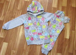 Второй с котиками светло серенький костюм. Выкройки те же, замечания те же, только размер 104. И на верхе и на штанишках серых добавила кармашки. В кулиску на капюшоне делала шнурок сама из футера с котиками.