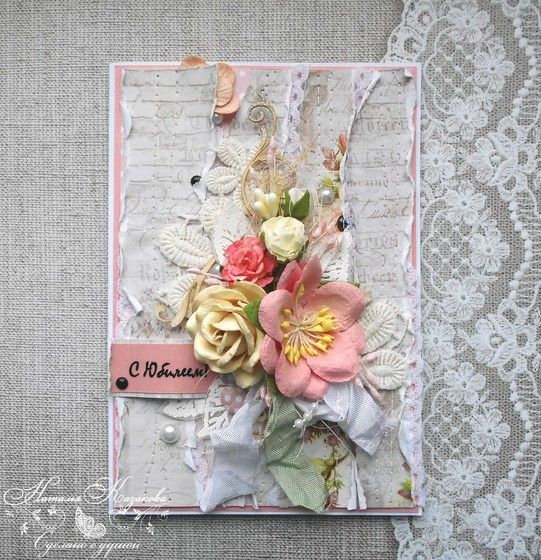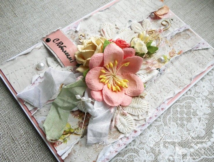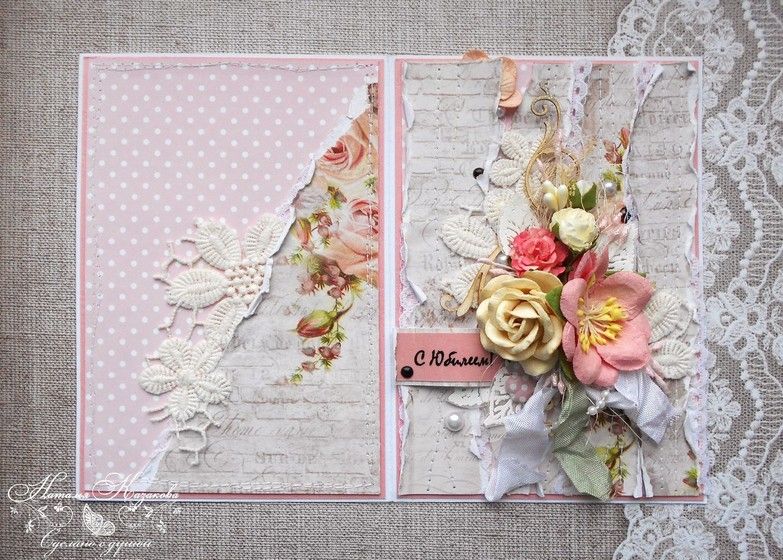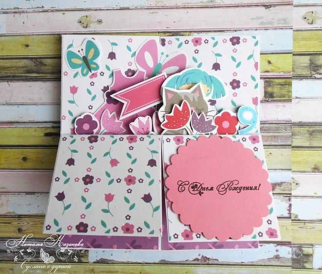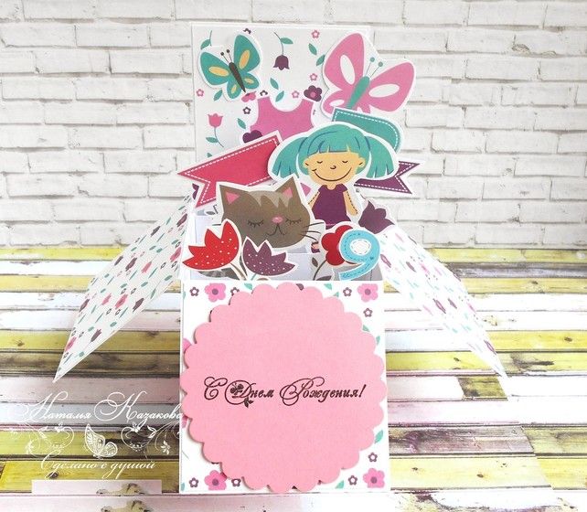 Ну и последняя на сегодня — детская открытка. Дочка ходила к подружке на день рождения, впервые решила попробовать такой вариант открыточки, делали вместе с ребенком.