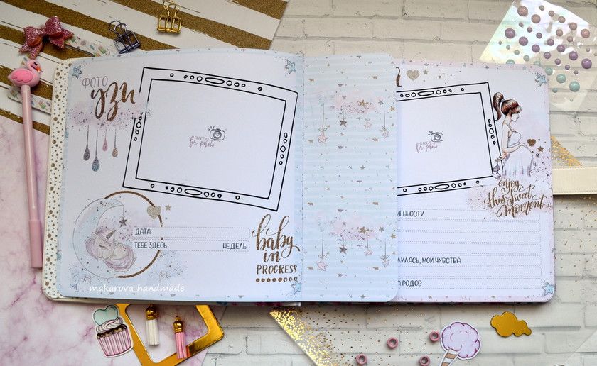 Внутри фотоальбома 30 листов с очень красивыми дизайнерскими страничками для записей самых важных событий роста и развития малышки от рождения и до трех лет: