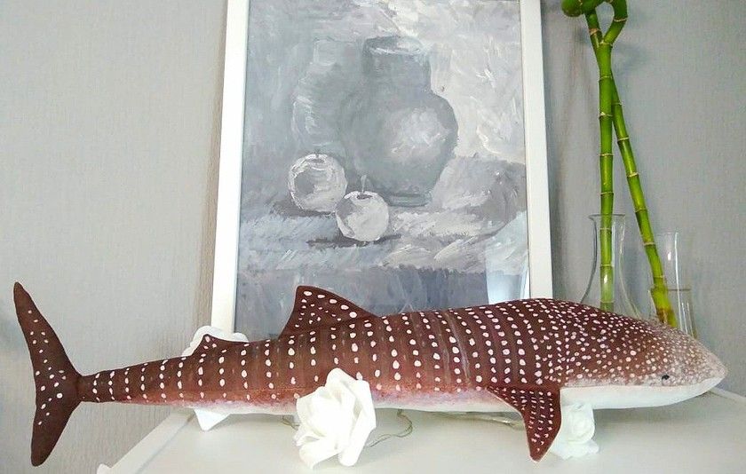 Анатомически точная копия китовой акулы. Выполнена их ткани Сатин 100% хлопок, расписана акриловыми красками. Интерьерная игрушка не боится воды, грязи, пыли, цвет не выгорает и не трескается со временем.