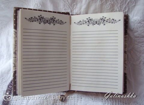 Формат блокнотика А6, 100 листочков, тонированных в кофе, разлиновку сделала сама. Форзацы из скрапбумаги от MF, обложка мягкая за счет слоя синтепона, обтянута американским хлопком. Закладка — атласная ленточка с деревянной бусиной.