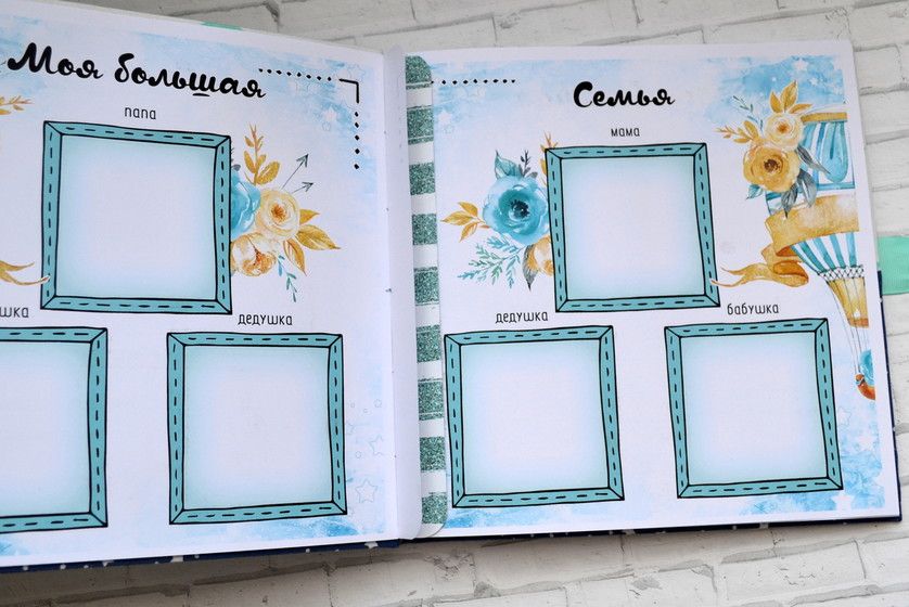 На заднем форзаце располагаются конвертики для хранения бирочки из роддома и первого отрезанного локона малыша!