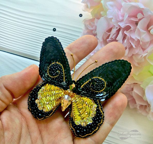 Всем привет! Красивая, эксклюзивная и неповторимая брошь-бабочка в черно-золотом цвете с кристаллами Сваровски, вышита самыми качественными материалами: золотой канителью, японским бисером, бусинами Сваровски, битью, французскими и итальянскими пайетками. Бабочка потрясающе блестит и очень красиво переливается.