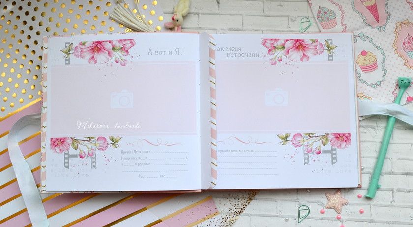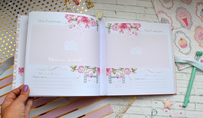 Внутри альбома как всегда крутые дизайнерские странички с множеством информации о том как растет и развивается малышка от момента нахождения в у мамы в животике и до дет. сада! Все самые важные воспоминания и самые трогательные фото теперь будут надежно храниться в этом альбоме!