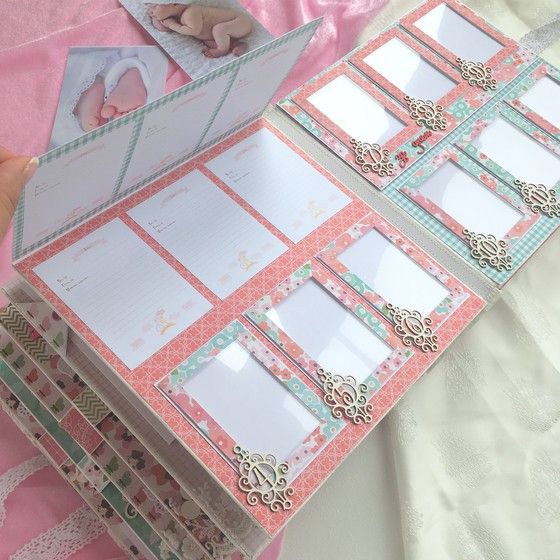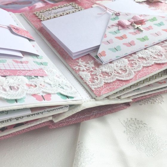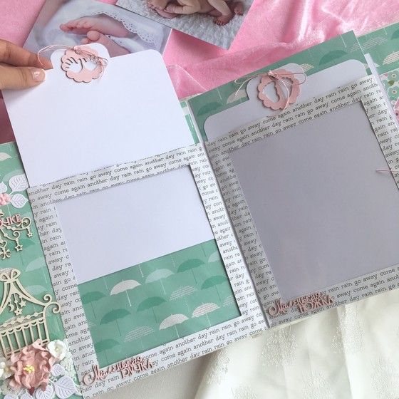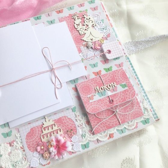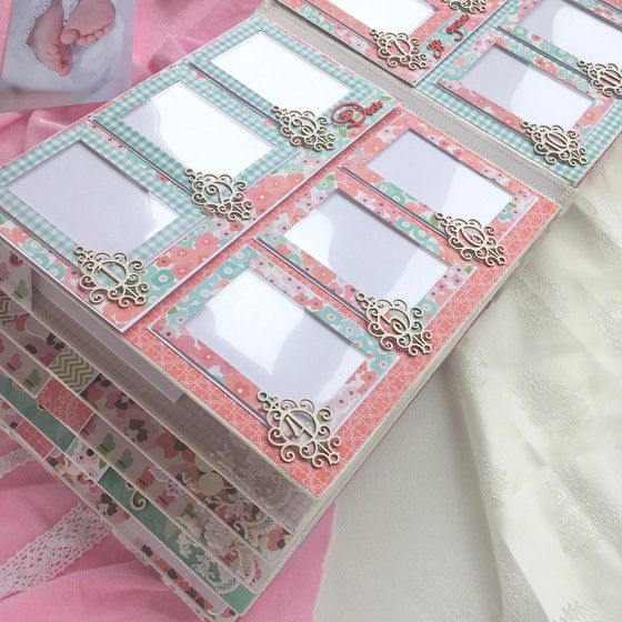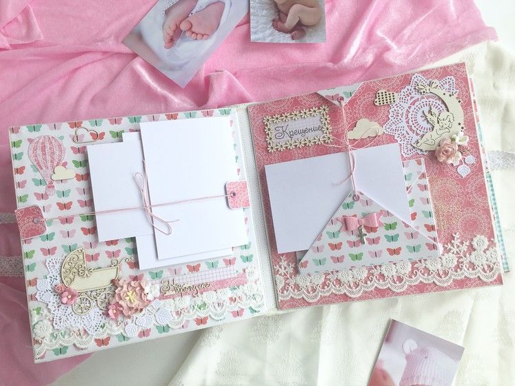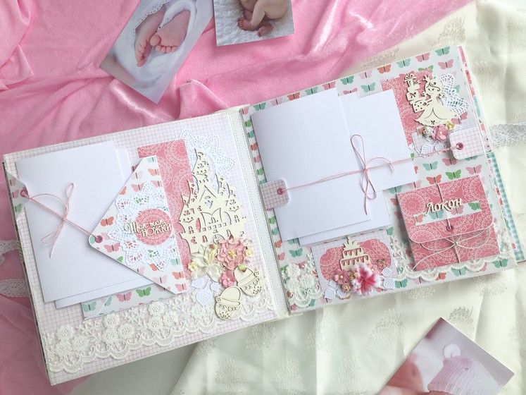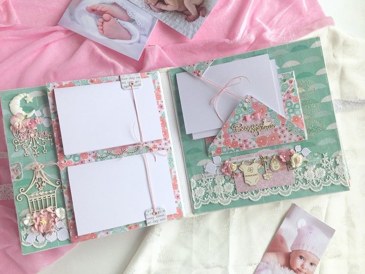 Альбом вмещает около 70 фотографий 10*15 см и около 20 фото 7*10 см. Также здесь много конвертов, где можно хранить записи и важные мелочи (например, тест, бирку, локон).