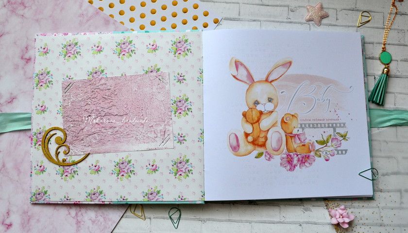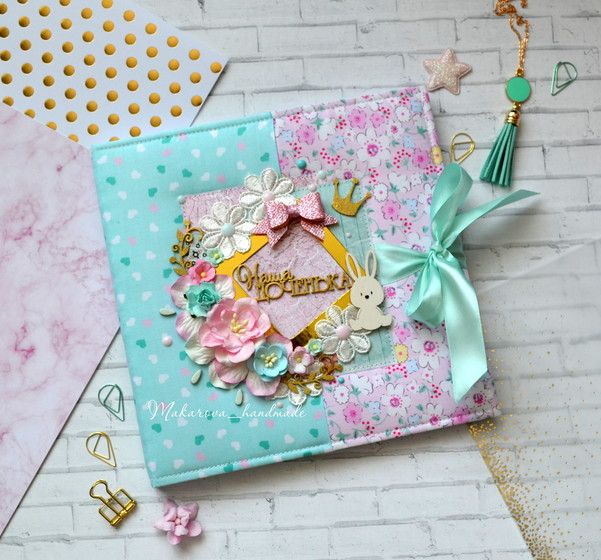 Буквально вчера я закончила работу вот над таким милым альбомом для девочки! Он в нежных мятно-розовых тонах, обложка выполнена из 100% хлопка, которая украшена цветами и декоративными элементами! Закрывается альбом на красивый бантик ?
