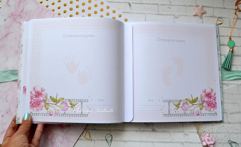 Внутри альбома 60 страниц с красивым дизайнерским оформлением) На страничках много места для размещения фото и записей самых важных моментов роста и развития малышки от самого рождения и до трех лет, а также есть раздел про детский сад!