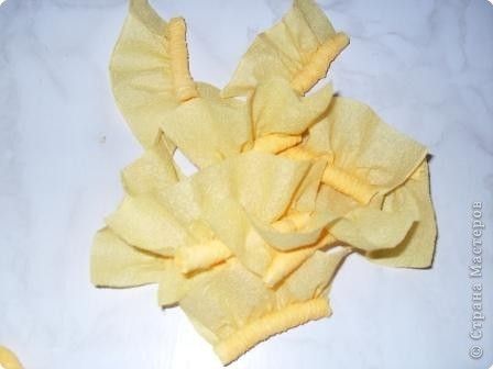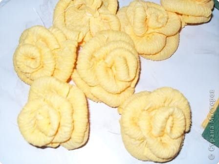 1. Всё что нужно для работы2. Разрезаем салфетку на 4 квадрата3. Берём одну часть и накручиваем её на карандаш4. Не доходя до самого края 3см5. Сдвигаем с 2-х сторон к середине и снимаем с карандаша6. Получились лепестки их надо много на изделие, на одну розочку 7шт7. Собираем из 7шт розу, укладывая их по кругу. Закрепляем розу несколькими витками нитки и завязываем узелки.8. Делаем листочки: салфетку режем на 4 части, берём одну и складываем треугольник9. Затем ещё раз треугольником и ещё раз10. Вот этот ещё раз11. Кончик получившейсязаготовки немного отрезать12. Срезаем к сгибу овал. При раскрытии получается вот так13. Вставляем нашу розу в лепесток, сжимаем и фиксируем ниткой поджимая повыше к розе. Получаются такие вот розочки.А вот само и дерево
