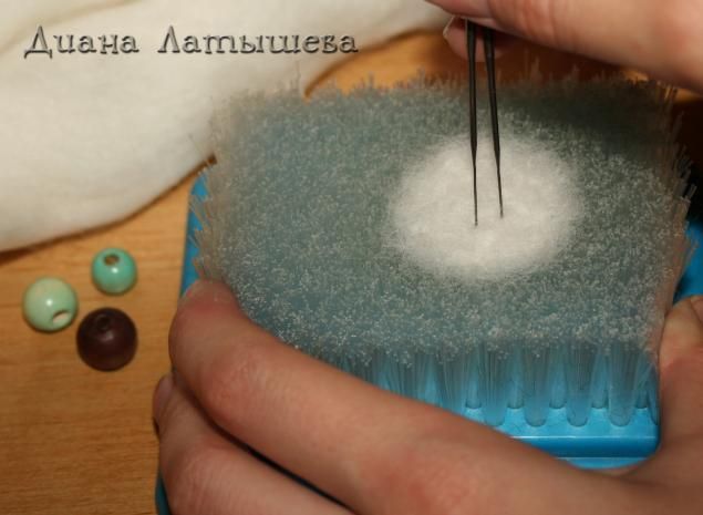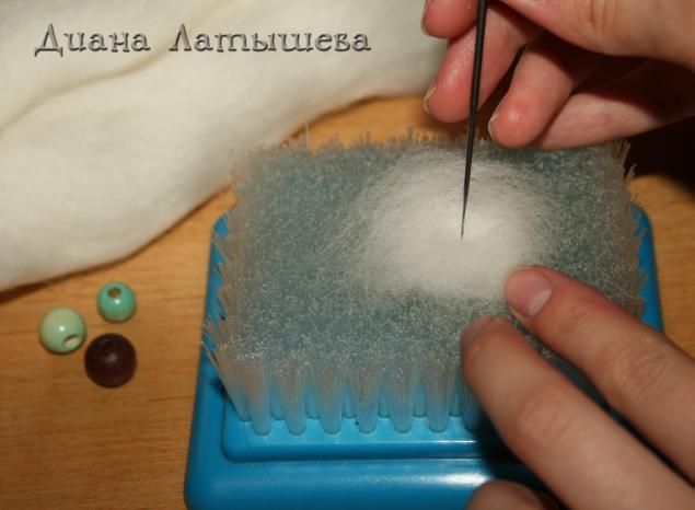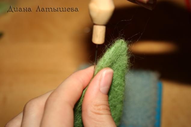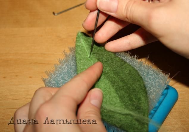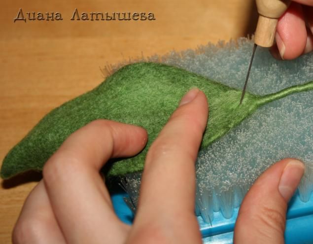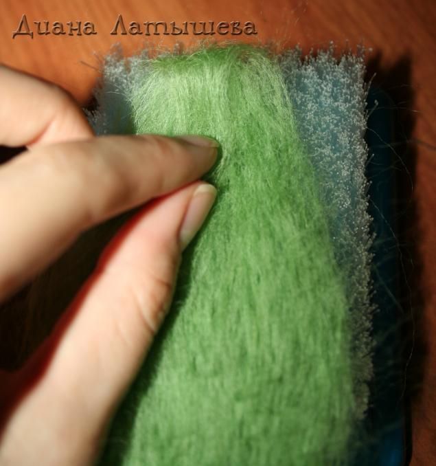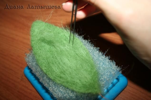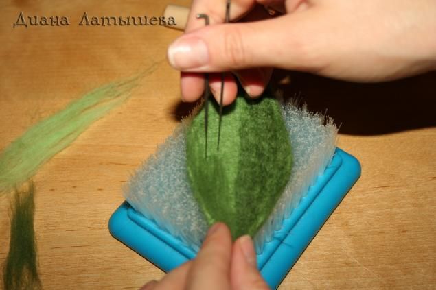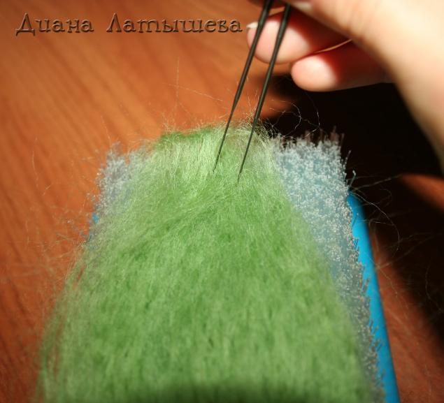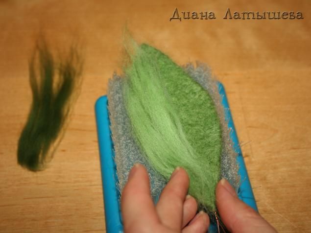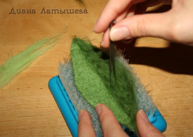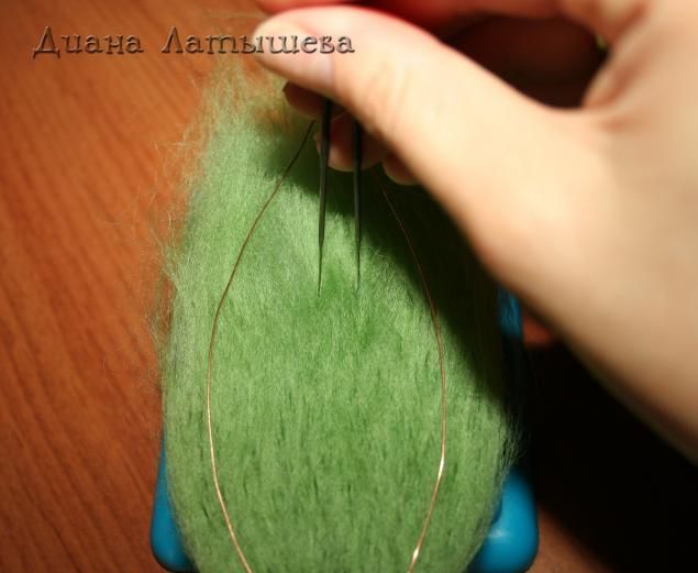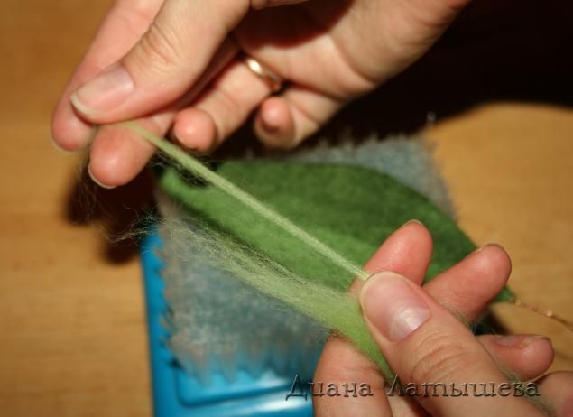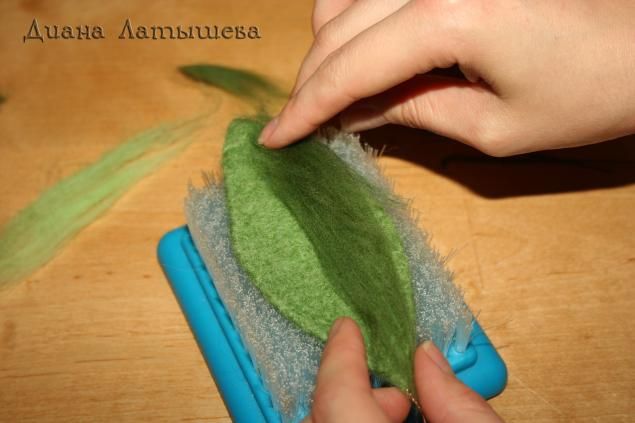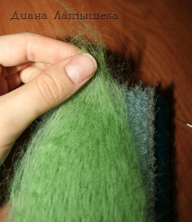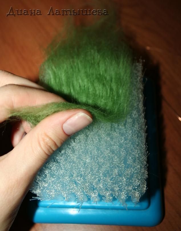 Берем прядь шерсти зеленого цвета и укладываем ее чуть больше, чем проволочный каркас. Кладем прядь на щетку и начинаем прокалывать ее иглами.